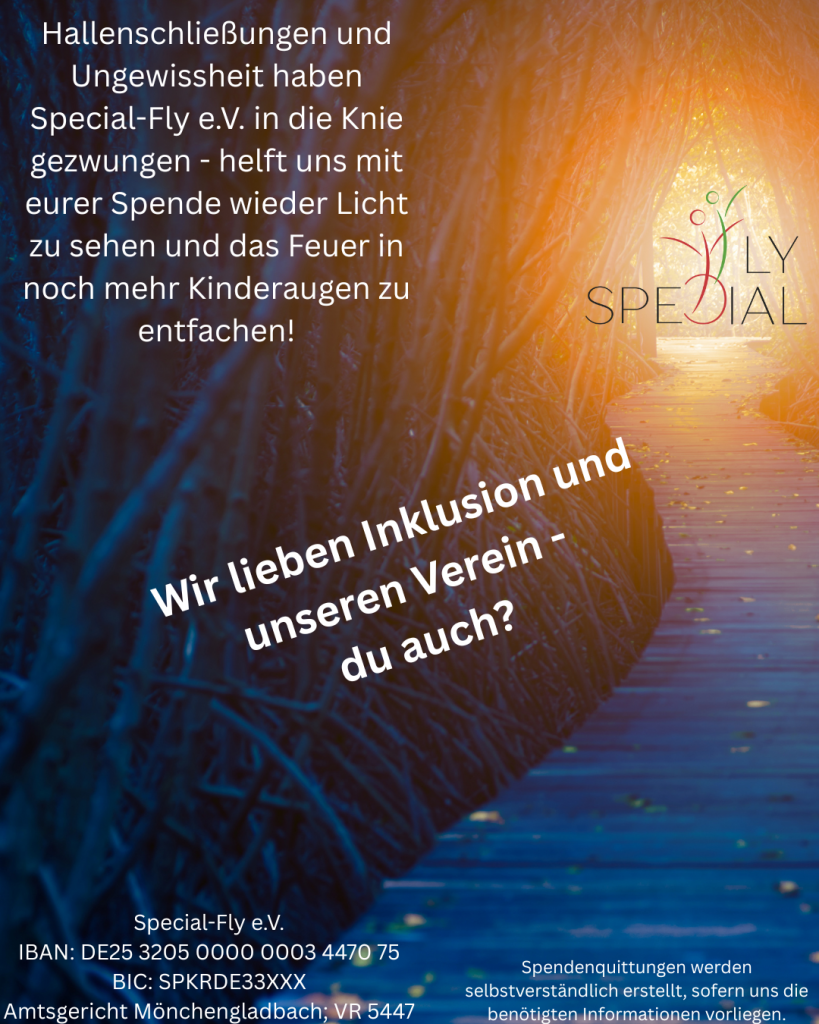 Manchmal läuft alles super – und dann erscheint aus dem Nichts ein Problem. Bereits seit dem Sommer kämpfen wir ums Überleben – Hallenschließungen, kurzfristige Absagen und eine ungewisse Zukunft. Doch trotz dieser Probleme kämpft Special-Fly weiter – denn jedes unserer Angebote ist für unsere Special-Kids so unglaublich wichtig! 🙂