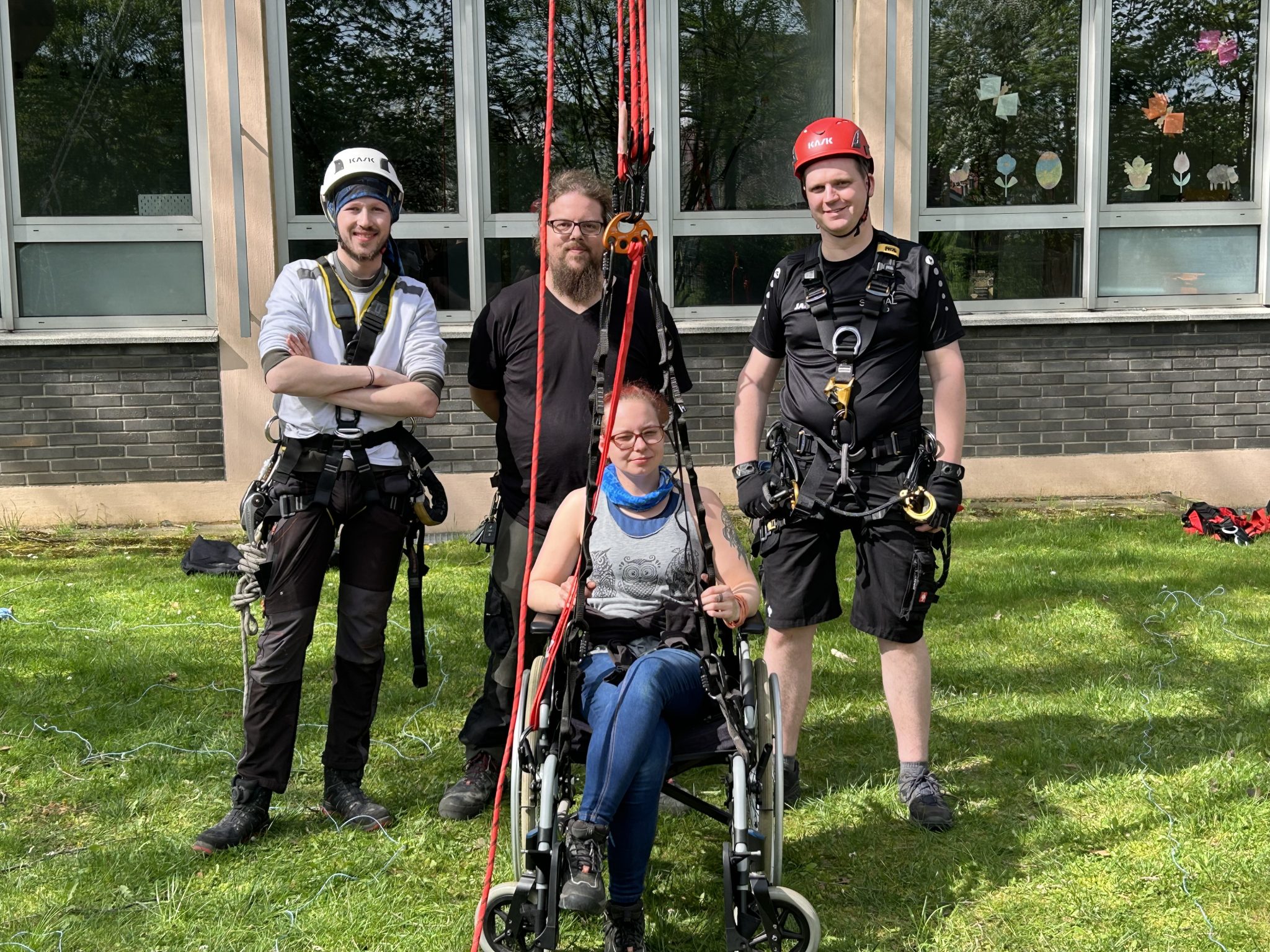 Die Rollstuhlkletterstation steht! Zusammen mit der Industriekletterfirma HGS Stolpmann haben wir die Rollstuhlkletterstation an der Franziskusschule aufgebaut. Egal ob man im Rollstuhl sitzt oder einfach mal im Rollstuhl klettern möchte - jeder kann sich mit diesem Aufbau 8m in die Höhe ziehen (oder ziehen lassen 🙂 ).
